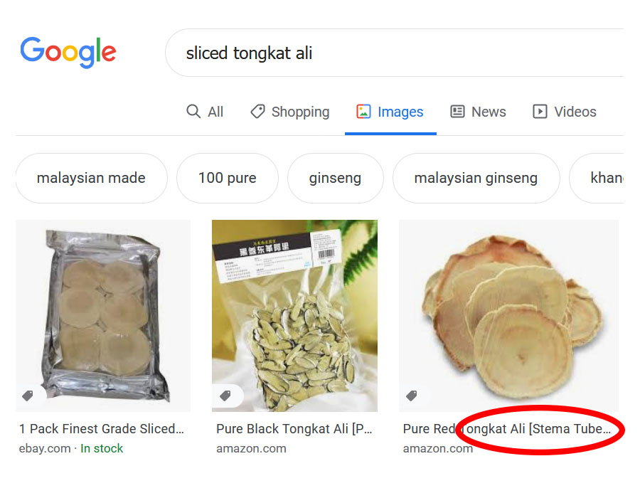 Incidentally, the screenshot already includes an indication of what sliced Tongkat Ali actually is: not Eurycoma longifolia, but an entirely unrelated plant, Stemona tuberosa.